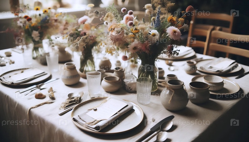Столовый пейзаж с ручным декором и несовместимым фарфором, Ai generated image
