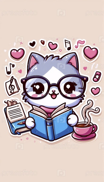 Ученый кот с очками и иллюстрацией к книге, Ai generated image