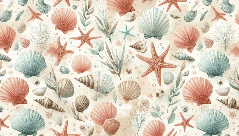 Водяной акварель прибрежных летних раковин морской рисунок, Ai generated image