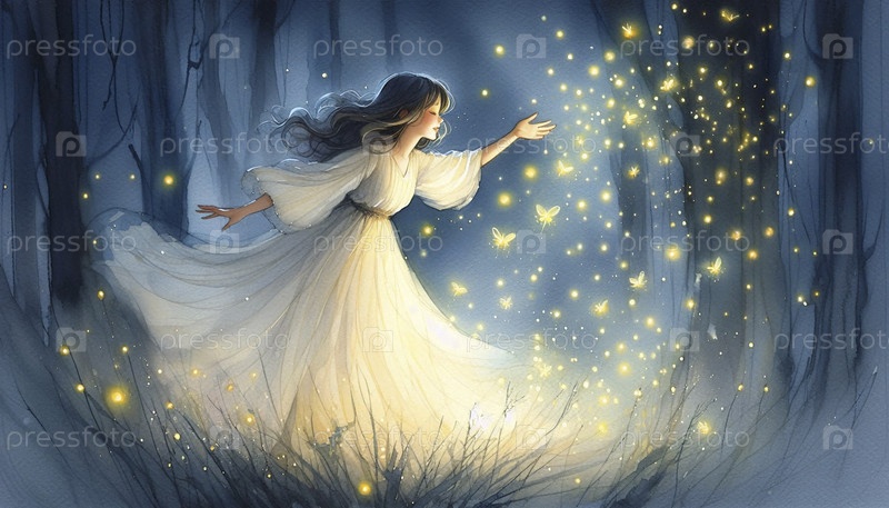 Принцесса в саду огненных мух акварельный арт-принт, Ai generated image