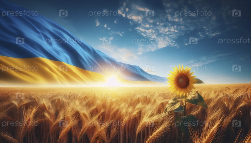 Украинский флаг на золотых пшеничных полях и небе, Ai generated image