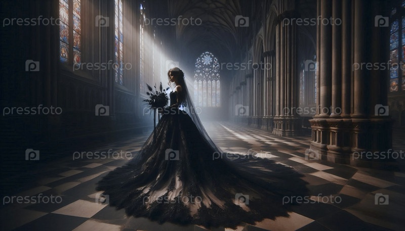 Готическая невеста в черном свадебном платье, Ai generated image