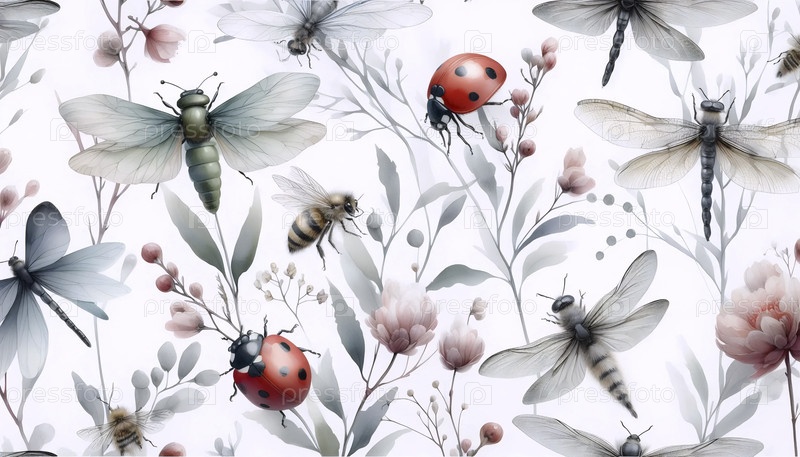 Нежный акварельный цвет насекомых ботанический бесшовный шаблон, Ai generated image