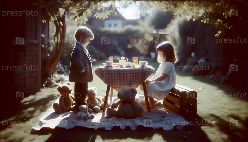 Очаровательный плакат чайной вечеринки с плюшевым медведем на заднем дворе, Ai generated image