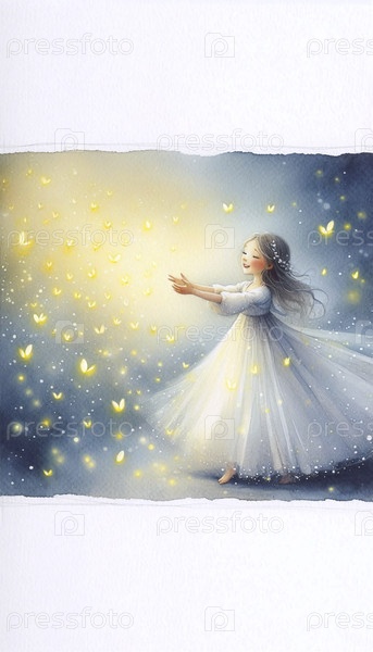 Принцесса в саду огненных мух акварельный арт-принт, Ai generated image