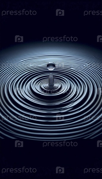 Чрезвычайно крупный макет поверхностного напряжения воды, нарушенного одной каплей, показывающий идеальные концентрические волны, Ai generated image