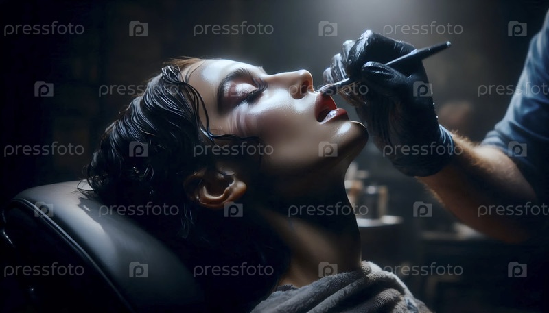 Более широкий снимок показывает актрису, опирающуюся на спину в кресле, сдаваясь процессу, Ай создал изображение