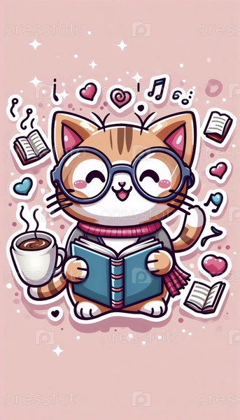 Ученый кот с очками и иллюстрацией к книге, Ai generated image