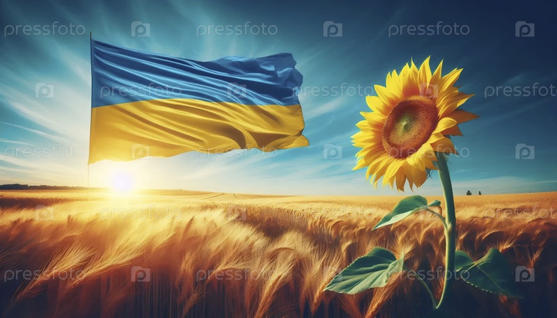 Украинский флаг на золотых пшеничных полях и небе, Ai generated image