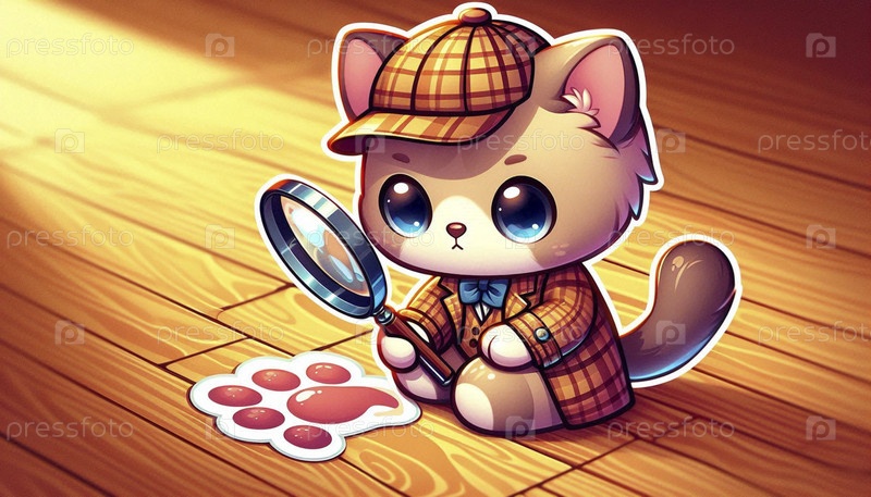 Милый мультфильмовый детективный кот, изучающий подсказки, Ai generated image