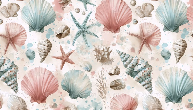 Водяной акварель прибрежных летних раковин морской рисунок, Ai generated image
