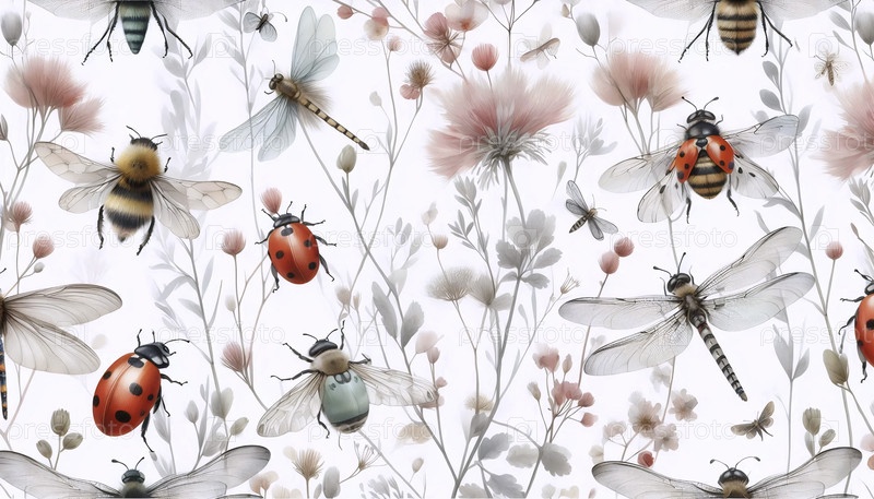 Нежный акварельный цвет насекомых ботанический бесшовный шаблон, Ai generated image