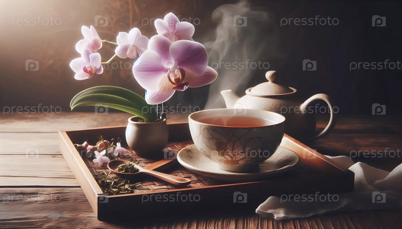 Орхидея с чашкой чая, Ай создал изображение