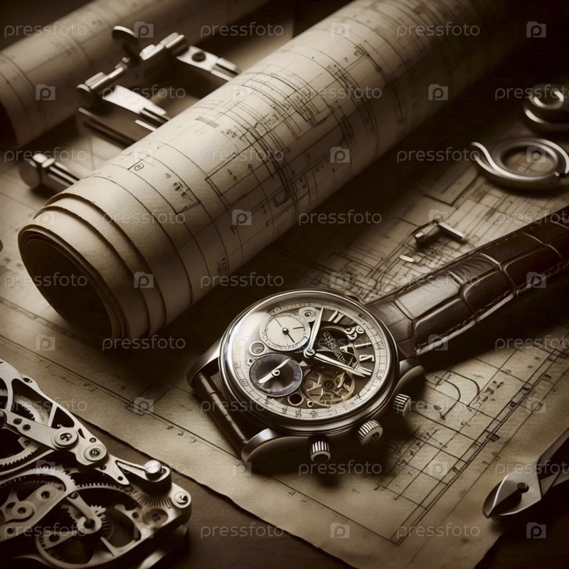 Удаленные наручные часы, лежащие на чертежах, Ai generated image