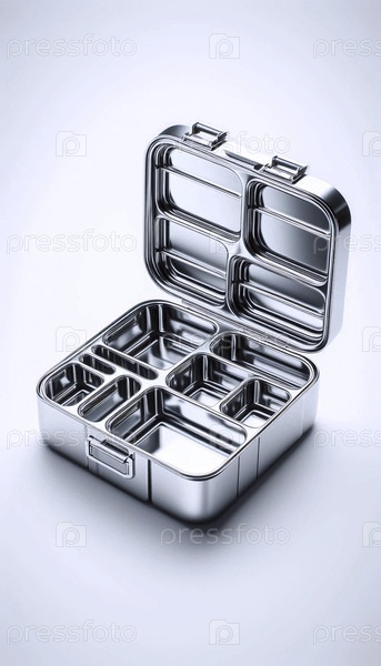 Утонченный, разделенный на отсеки макет обеденной коробки из нержавеющей стали, открытый и пустой, на белой поверхности Ai generated image
