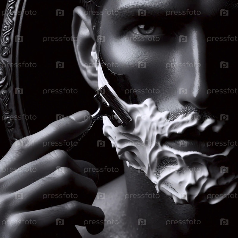 Брится прямой бритвой при слабом свете, Ai generated image