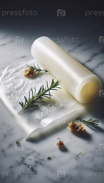 Лист натурального пчелиного воска с макетом упаковки продуктов питания, частично сложенный на мраморном столе со свежими травами, Ai generated image
