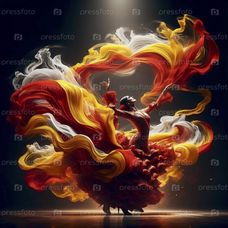Испанский флаг, выходящий из платья танцоров-фламенко, Ai generated image