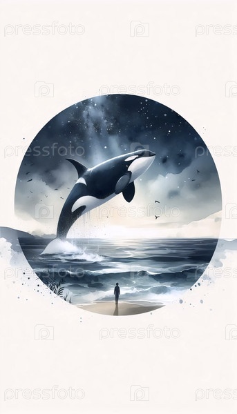 Печатная акварельная печать кита-орки и ребенка, Ai generated image