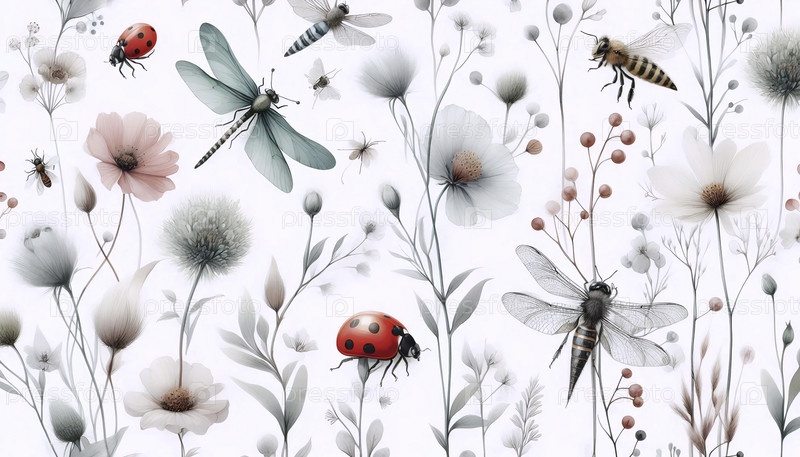 Нежный акварельный цвет насекомых ботанический бесшовный шаблон, Ai generated image
