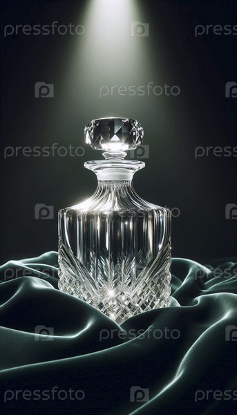 Мокет полностью свинцового кристаллического декантера на глубокой изумрудной меховой ткани, Ai generated image
