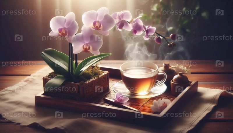 Орхидея с чашкой чая, Ай создал изображение