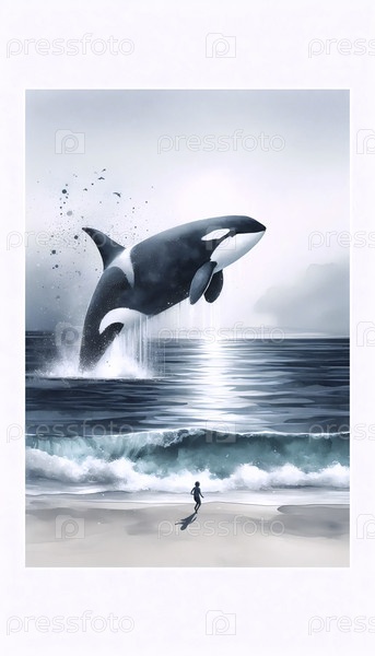 Печатная акварельная печать кита-орки и ребенка, Ai generated image