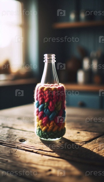 Мокет прозрачной стеклянной бутылки с молоком, расположенный в красочном трикотажном многоразовом рукаве на деревянном кухонном столе, Ai generated image