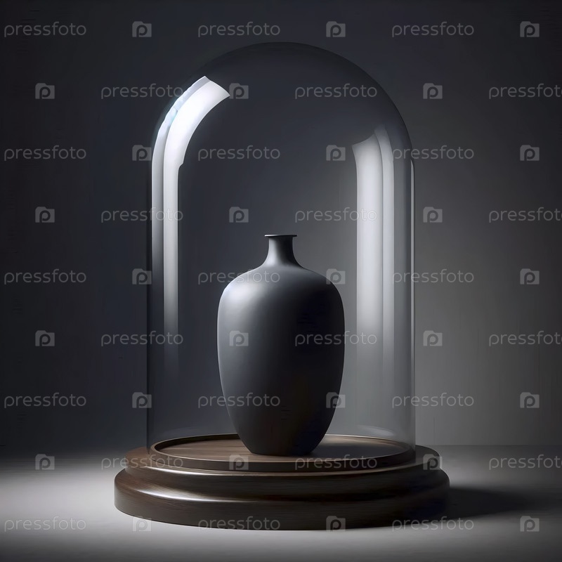 Матовый черный керамический макет вазы под большой стеклянной колокольницей на темном пьедестале из окрашенного дуба, Ai generated image
