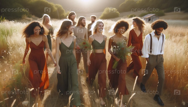 Свадебная вечеринка в богатых зеленых оливковых и терракотовых тонах, Ai generated image