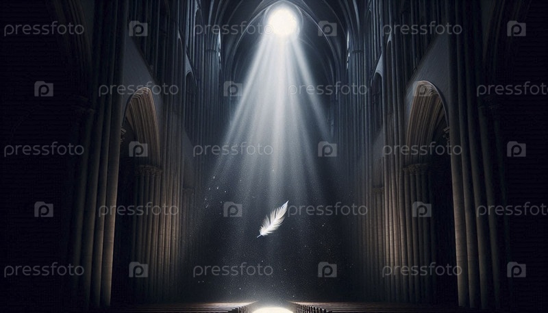 Одно перо, подвешенное от луча света в темном соборе, Ai создало изображение