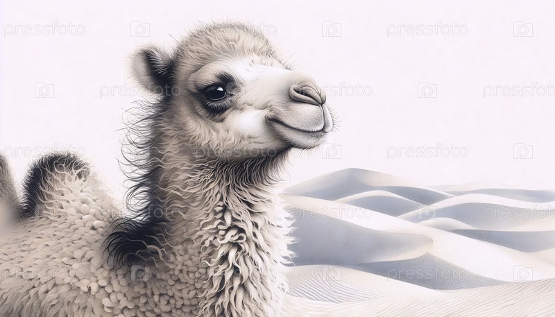 Ребенок верблюд в пустыне чернила рисование художественная печать, Ai generated image