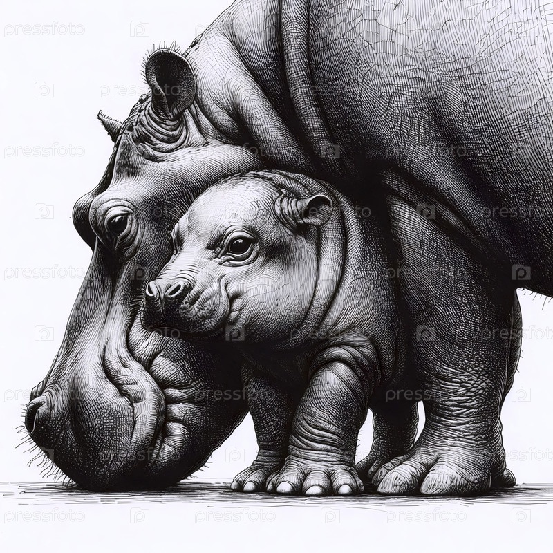 Baby Hippo чернила рисования художественная печать, Ai generated image