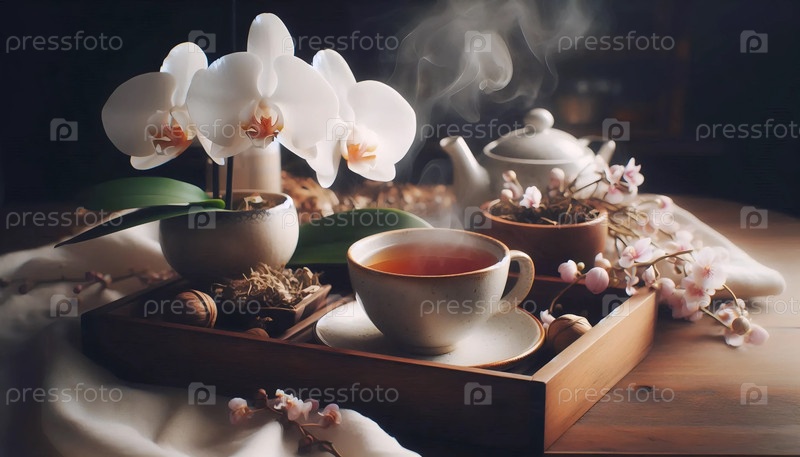 Орхидея с чашкой чая, Ай создал изображение
