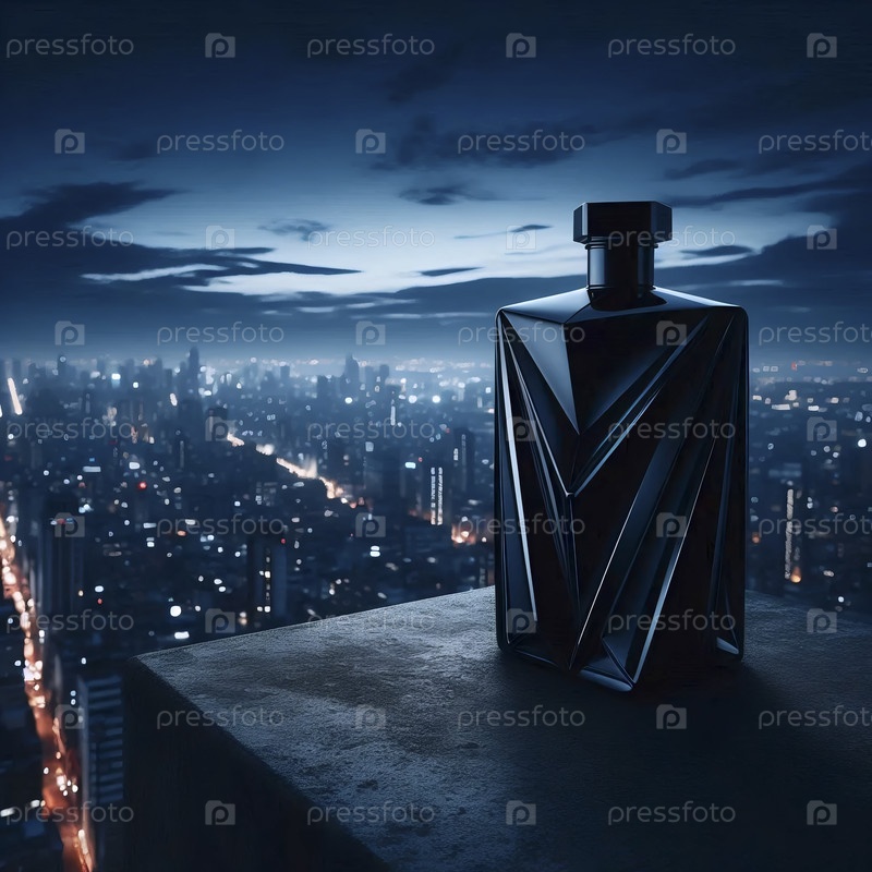 Современный угловой макет бутылки, расположенной на парапете городской крыши во время синего часа, Ай создал изображение