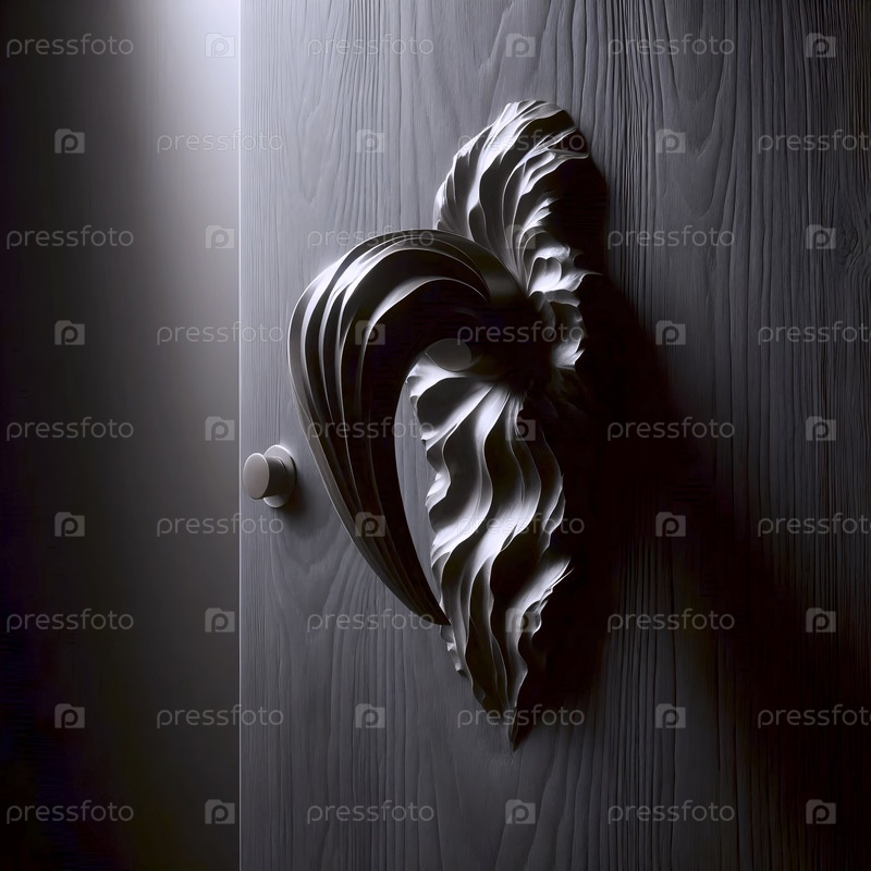 Тяжелый, литый бронзовый макет дверной ручки, установленный на двери от пола до потолка из выдыхаемого черного дуба с освещением со стороны соседней комнаты