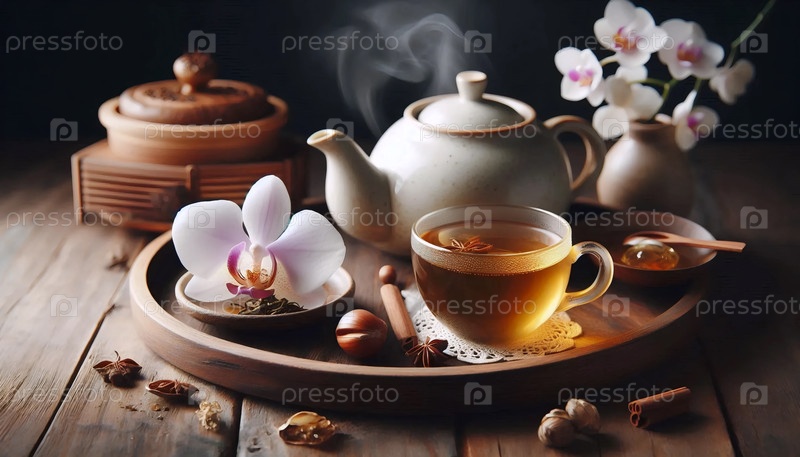 Орхидея с чашкой чая, Ай создал изображение