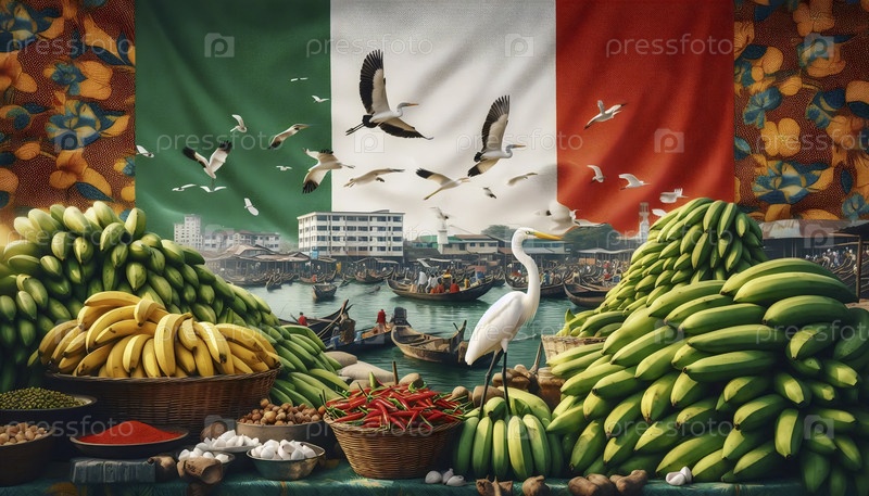 Нигерийский флаг на оживленном лагосском рынке и энергетическом комплексе, Ai generated image
