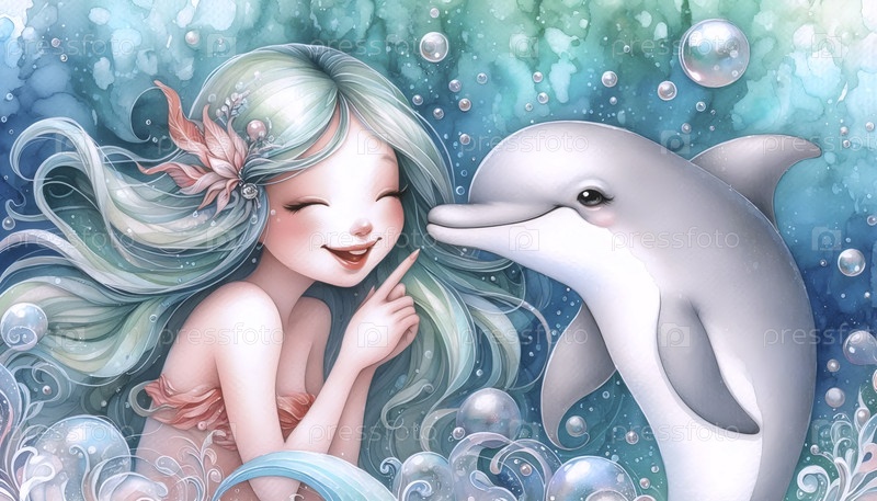Русалка делится секретом с акварельной печатью дельфина, Ai generated image