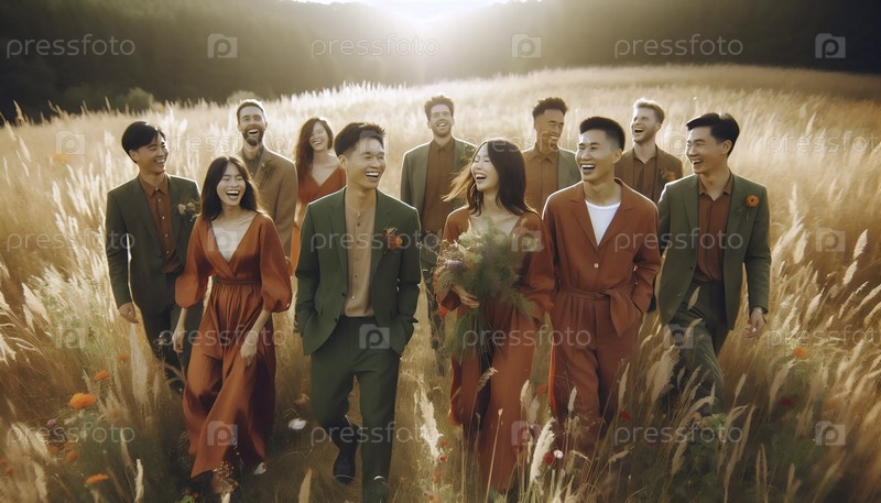 Свадебная вечеринка в богатых зеленых оливковых и терракотовых тонах, Ai generated image