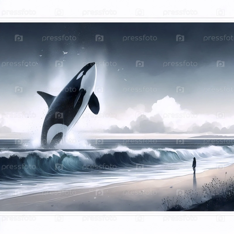 Печатная акварельная печать кита-орки и ребенка, Ai generated image