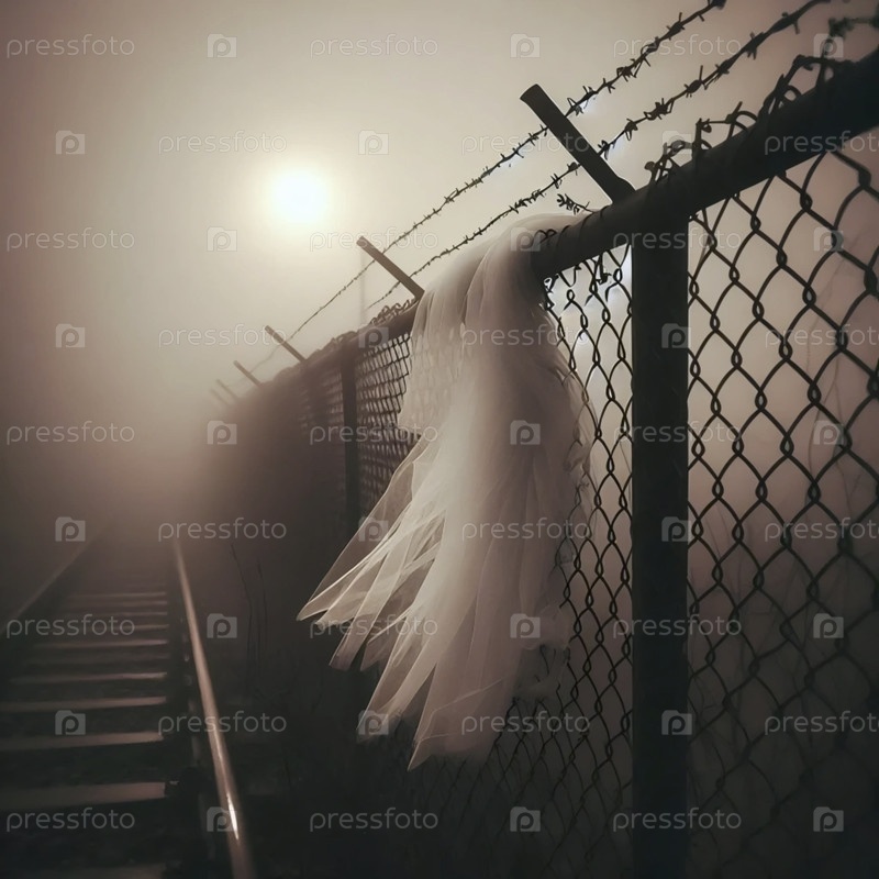 Свадебный платок, застрявший на заборе с цепными звеньями, Ai generated image