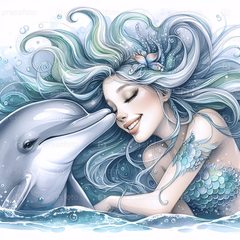 Русалка делится секретом с акварельной печатью дельфина, Ai generated image