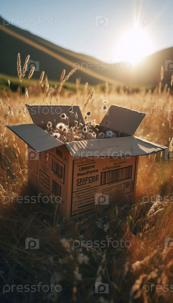 Мокет морской коробки из гофрированного картона с семенами дикорастущих цветов, встроенных в швы бумажной ленты, на травянистом поле, Ai generated image