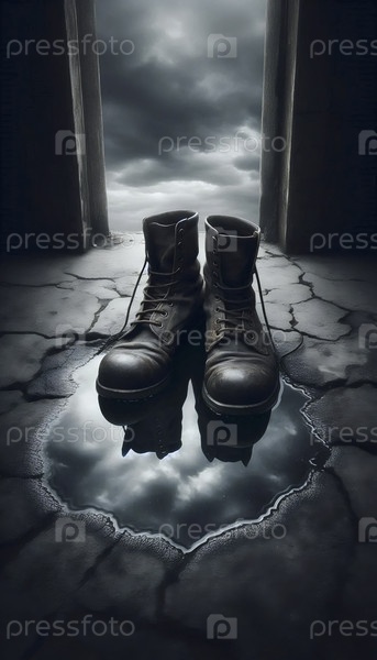 Пара изношенных рабочих сапог заполнена дождевой водой, Ai generated image