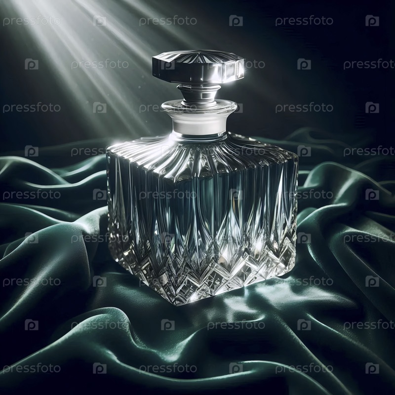 Мокет полностью свинцового кристаллического декантера на глубокой изумрудной меховой ткани, Ai generated image