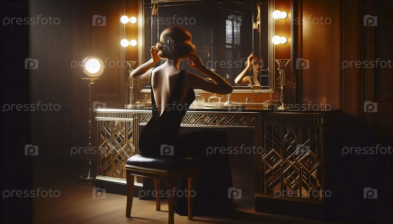 Женщина в черном бархатном платье с оболочкой на ар-деко суете, Ai generated image