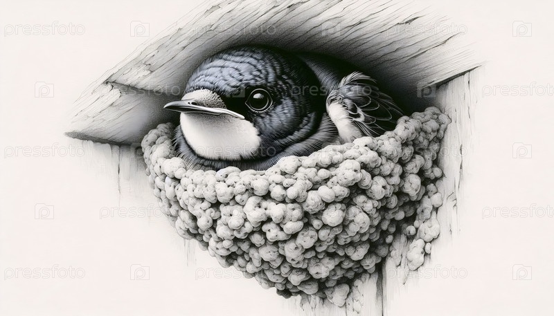 Гусеничное цыпленок в глиняном гнезде чернила рисование художественная печать, Ai generated image