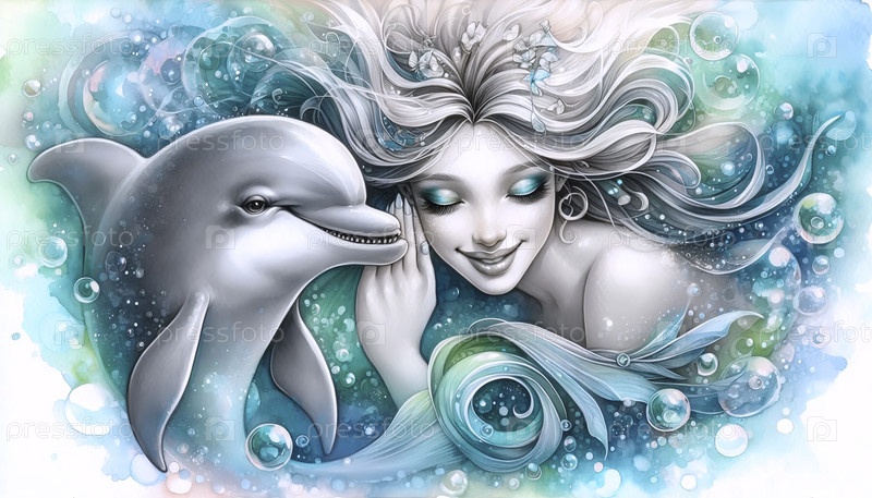 Русалка делится секретом с акварельной печатью дельфина, Ai generated image