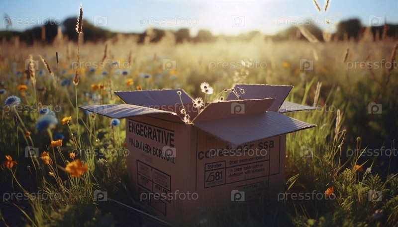 Мокет морской коробки из гофрированного картона с семенами дикорастущих цветов, встроенных в швы бумажной ленты, на травянистом поле, Ai generated image